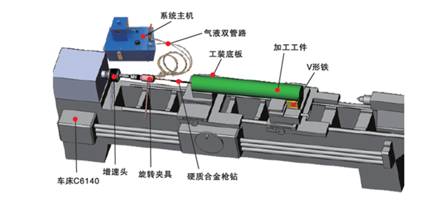 主要用于小直徑(一般小于35mm)深孔的鉆削加工,所需切削液壓力高。是最常見(jiàn)的深孔鉆削加工方式。其屬于內(nèi)冷外排屑方式,切削液通過(guò)中空的鉆桿內(nèi)部,到達(dá)鉆頭頭部進(jìn)行冷卻潤(rùn)滑,并將切屑從鉆頭及鉆桿外部的V型槽排出。適宜于中小批量的金石QYZ深孔鉆系統(tǒng)同樣屬于槍鉆加工系統(tǒng),可方便的配置在車(chē)床、鏜床、加工中心等普通機(jī)床上,其刀具使用槍鉆,高壓力的氣霧為其提供冷卻和排屑的動(dòng)力。